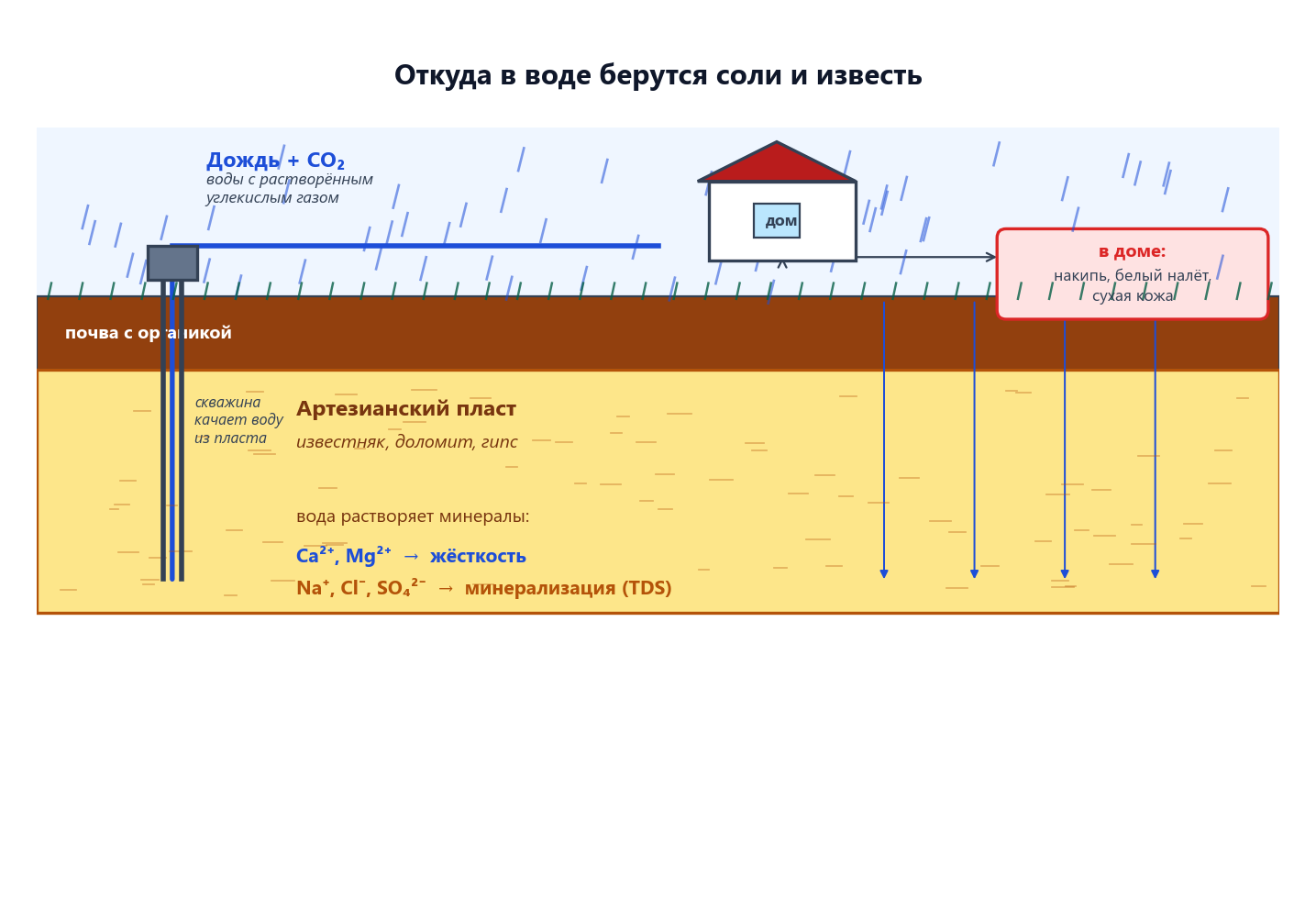 | Накипь на тэне, чайнике, в бойлере | Ca²⁺ + HCO₃⁻ → CaCO₃ при нагреве | Жёсткость |
