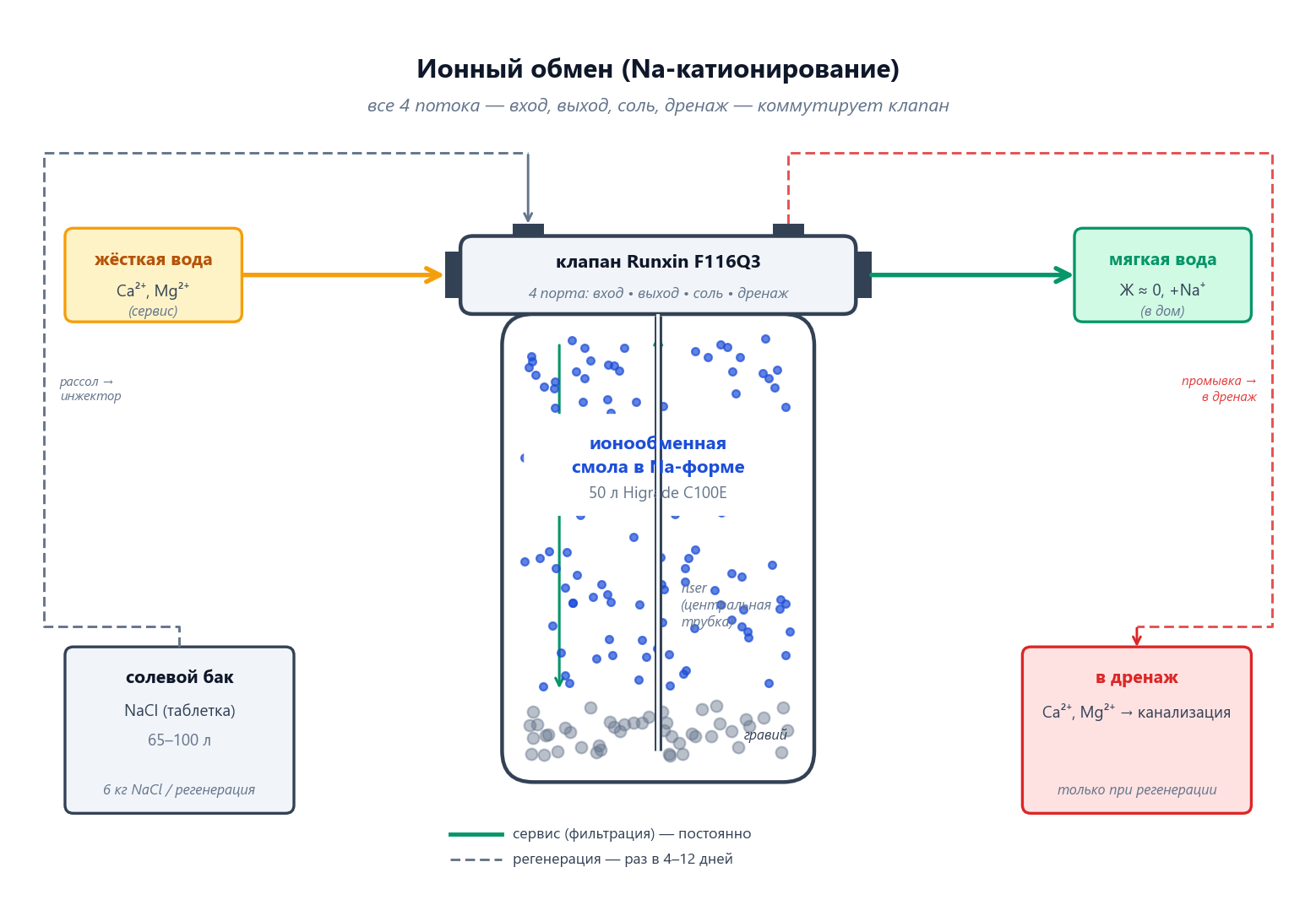 Смола постепенно «набивается» кальцием и теряет ёмкость. Когда запас Na⁺ исчерпан — клапан автоматически включает регенерацию: прокачивает концентрированный рассол через колонну, вытесняет Ca и Mg обратно (они уходят в дренаж), а смолу снова заряжает натрием. Цикл повторяется годами. Смола живёт 5–7 лет при правильной эксплуатации.