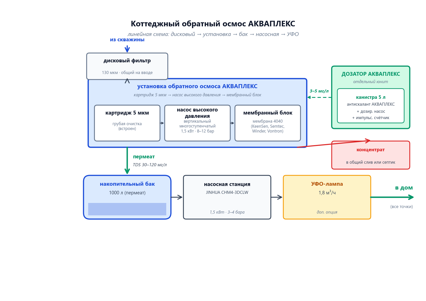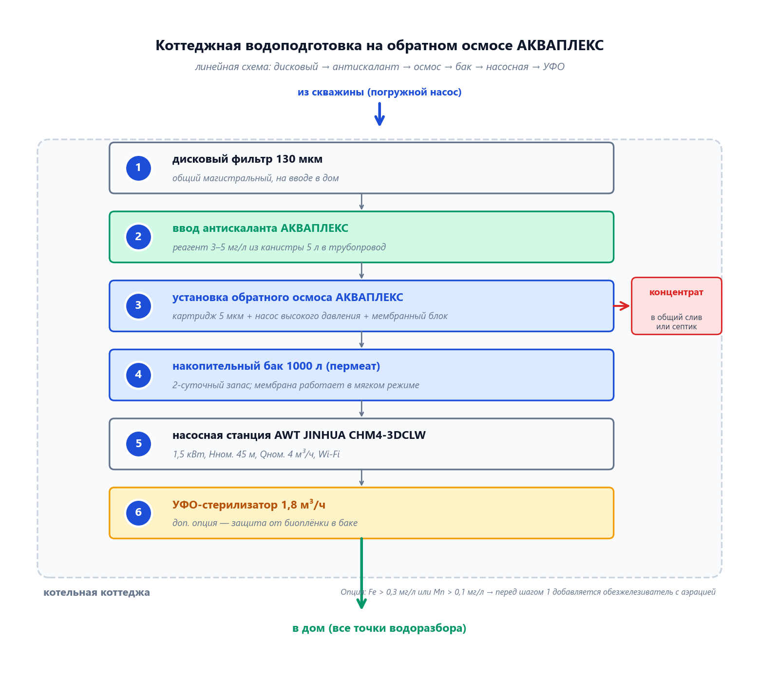 Почему не «умягчитель + осмос на весь дом»? Такая комбинация технически работает, но невыгодна: вы платите и за соль (умягчитель), и за антискалант (осмос). При этом задача, ради которой обычно ставят умягчитель перед осмосом — защитить мембрану от CaCO₃ — уже решается антискалантом АКВАПЛЕКС самостоятельно, без колонны с солью на входе. Поэтому в коттеджной практике мы ставим либо одно, либо другое, а не последовательно.