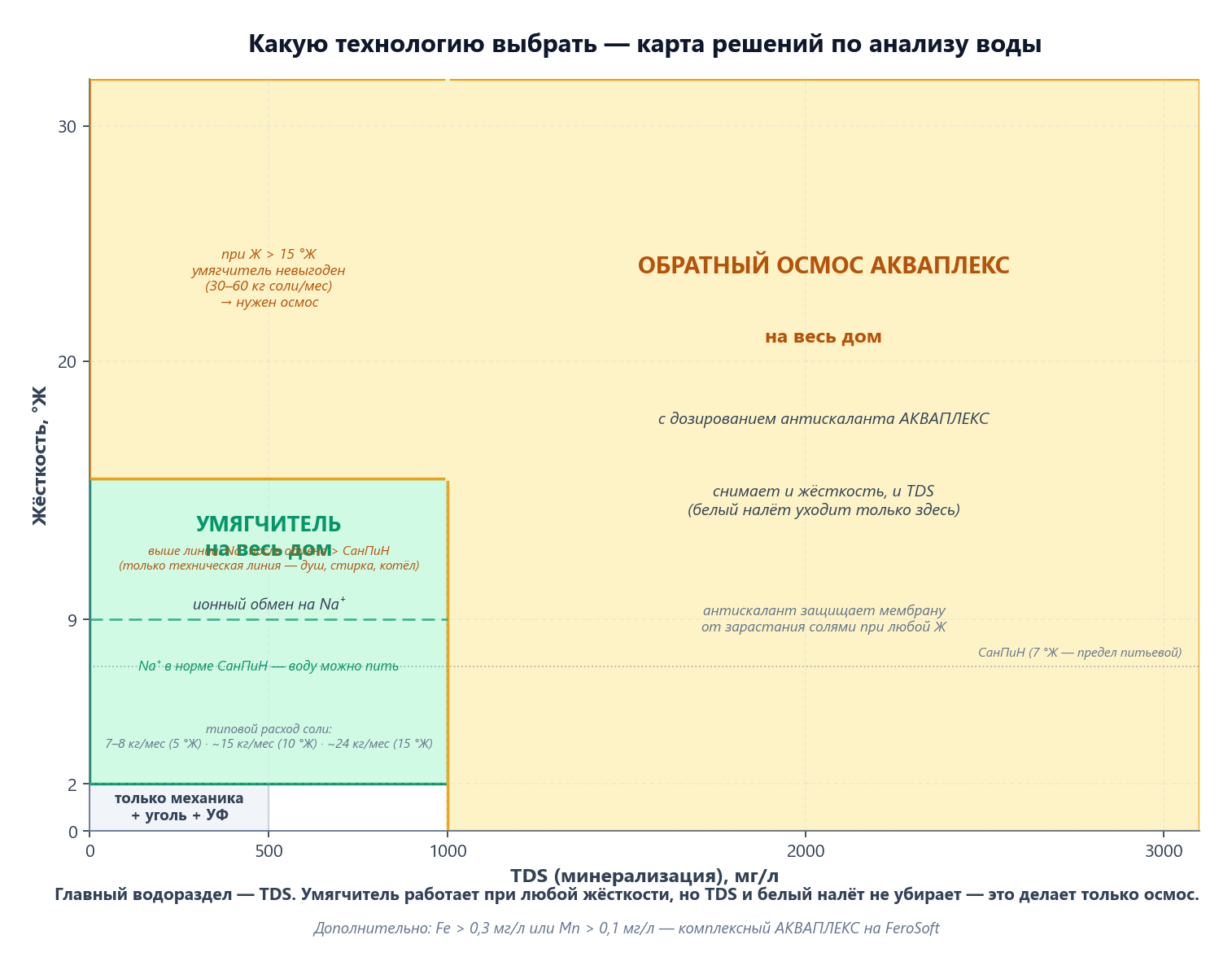 | TDS > 1000 мг/л, любая жёсткость, «белые пятна» на посуде, солоноватый/горький вкус | Обратный осмос АКВАПЛЕКС на весь дом | Умягчитель не убирает сухой остаток и белый налёт — только переводит кальций в натрий. Мембрана обратного осмоса снимает и жёсткость, и TDS за один проход. Антискалант АКВАПЛЕКС защищает мембрану от зарастания кальцием — работает при любой исходной жёсткости, до 25 °Ж без проблем. |